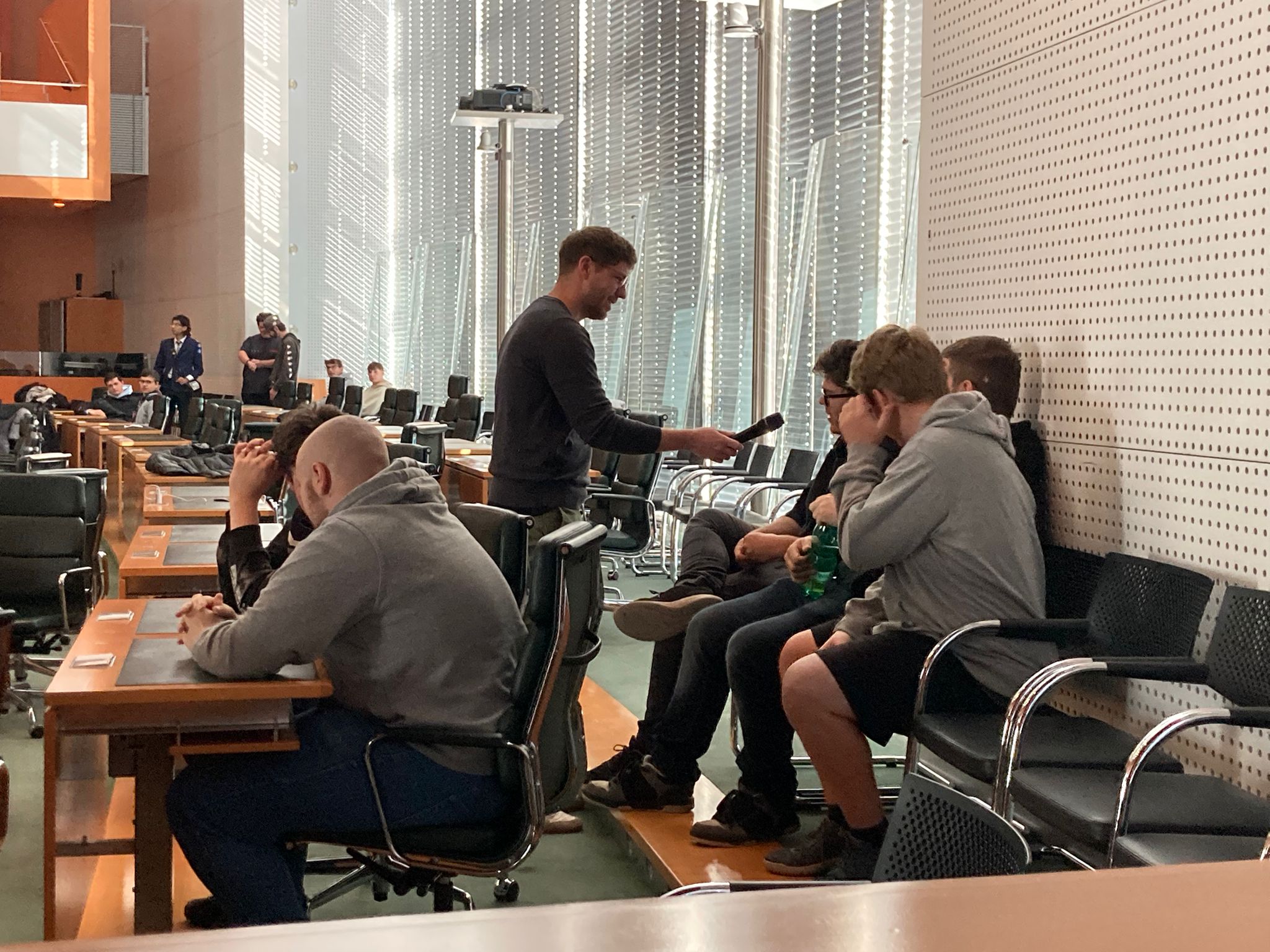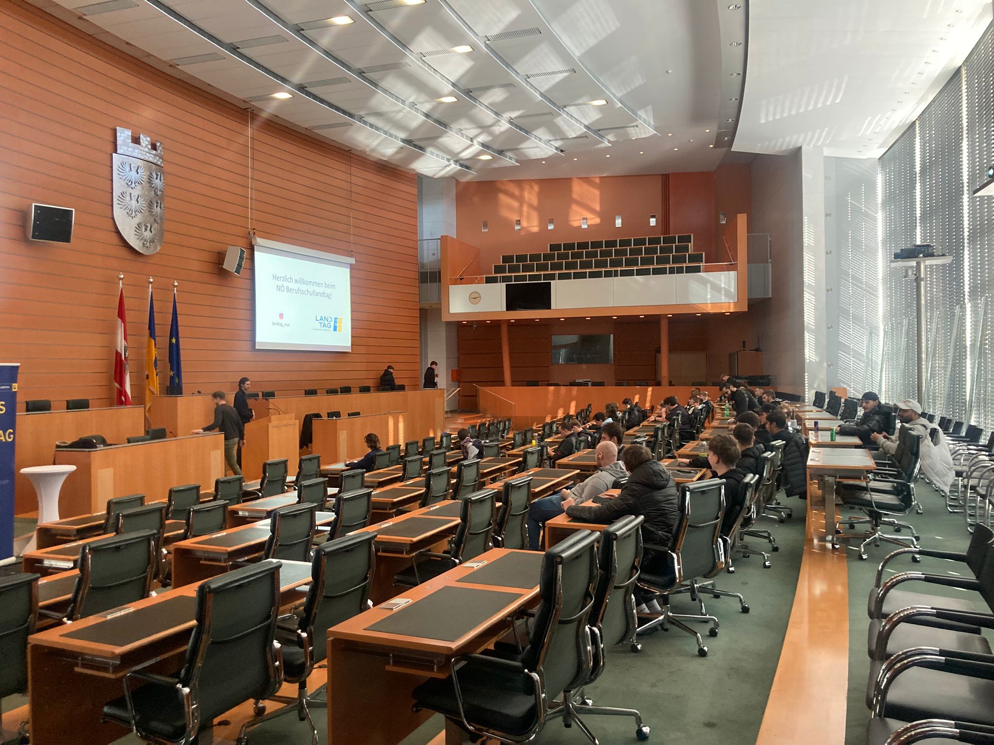 Die 2.GBT1 besuchte zusammen mit der 2.GGG1 begleitet von den Fachlehrerinnen Christina Müller und Ingrid Hammerl am 29. Oktober 2025 den NÖ Landtag in St. Pölten. Im Sitzungssaal konnten die Lehrlinge dann Demokratie erleben, indem sie selbst einmal „Abgeordnete“ sein durften. Der Besuch das Berufsschullandtages ist ein fixer Bestandteil des Unterrichtsgegenstandes Politische Bildung an der LBS Langenlois. Nach dem Mittagessen folgte eine informative Führung im Haus der Geschichte. Alles in allem ein spannender Tag.